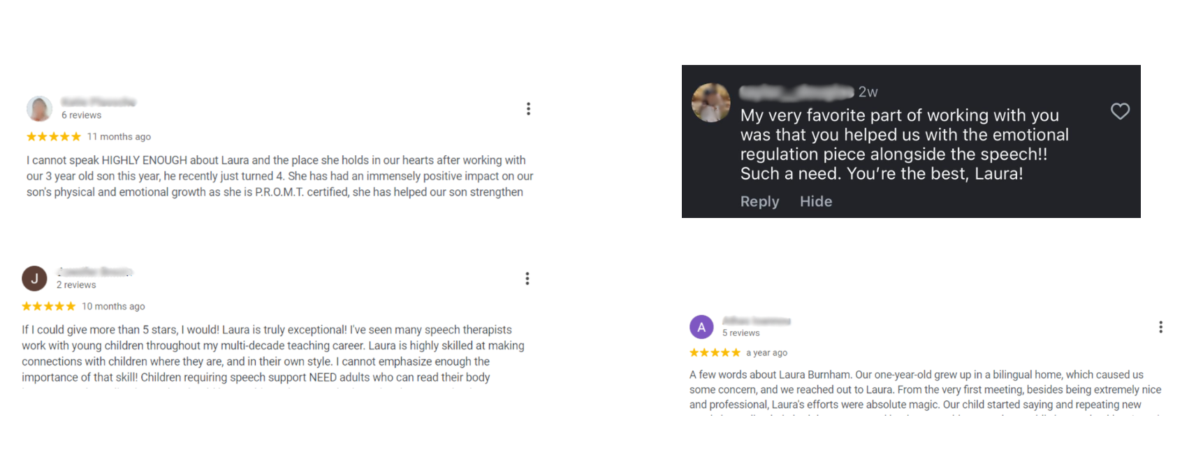 I’m Laura Burnham, M.A., CCC-SLP, TSSLD, a licensed and certified pediatric speech-language pathologist with a private practice in NYC.